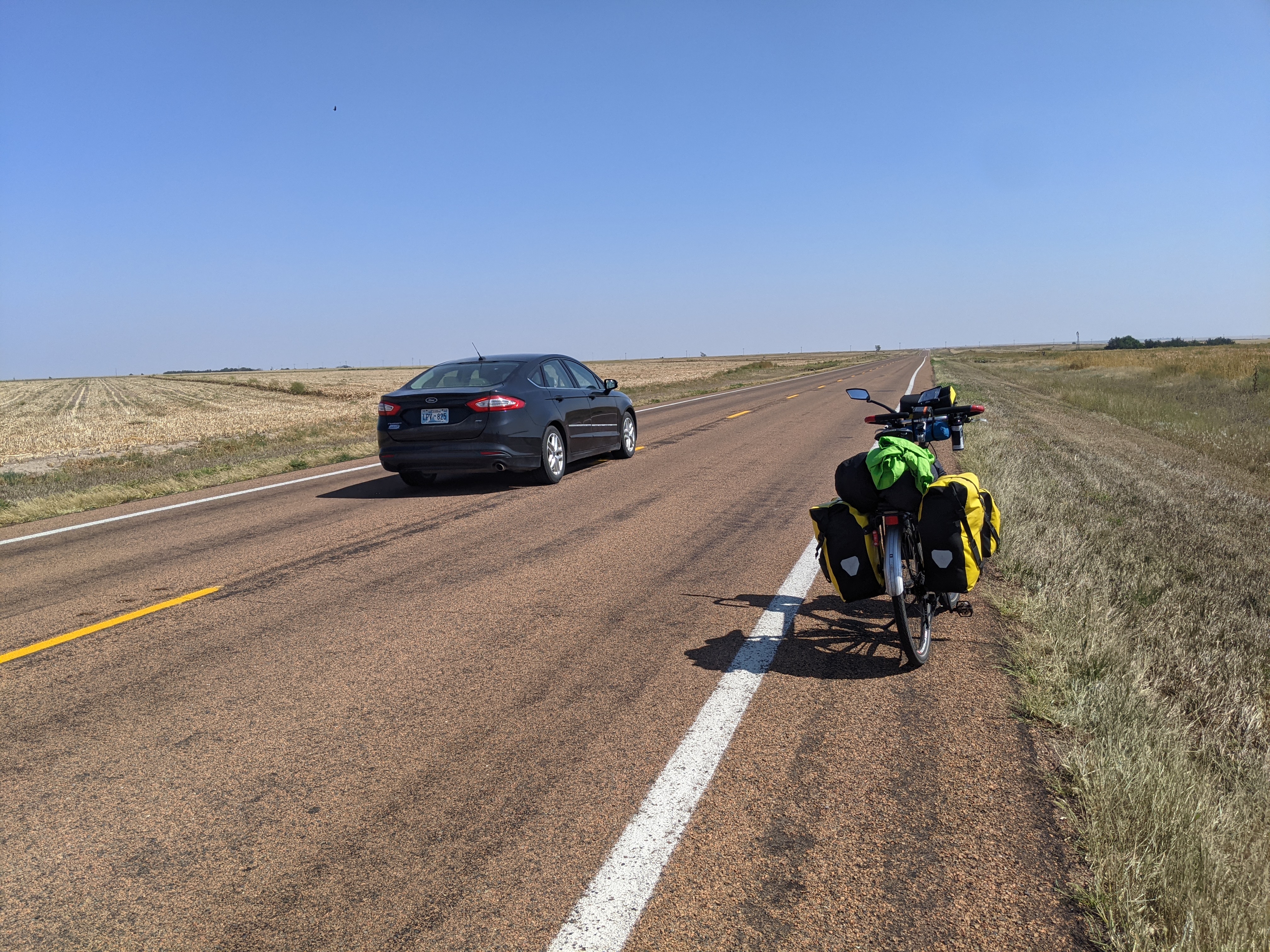 On the Plains, cycling on these long straight roads took some getting used to. In fact, after the Rockies, it felt positively odd. It didn't seem to make sense. You would peddle along, and in the distance would see a car or truck appearing on the horizon. You would keep peddling, then, a bit later, look up, and it wouldn't have moved. Maybe just got a tiny bit bigger. Again, after some time, you look up again. Again a bit bigger, but nowhere close. Finally, after what seems ages, you could hear it, and then finally it would pass you, and equally slowly, disappear from your rearview mirror.