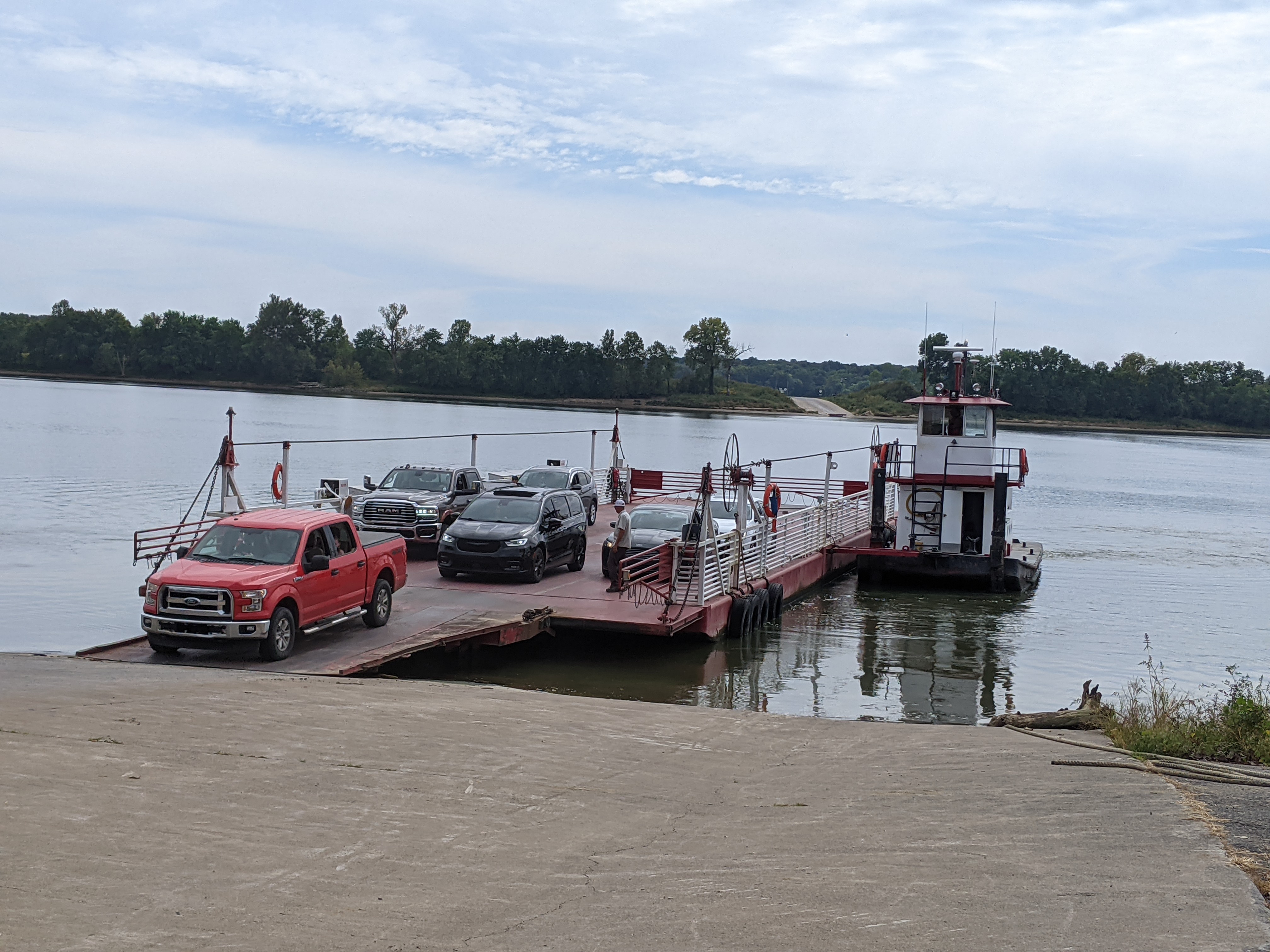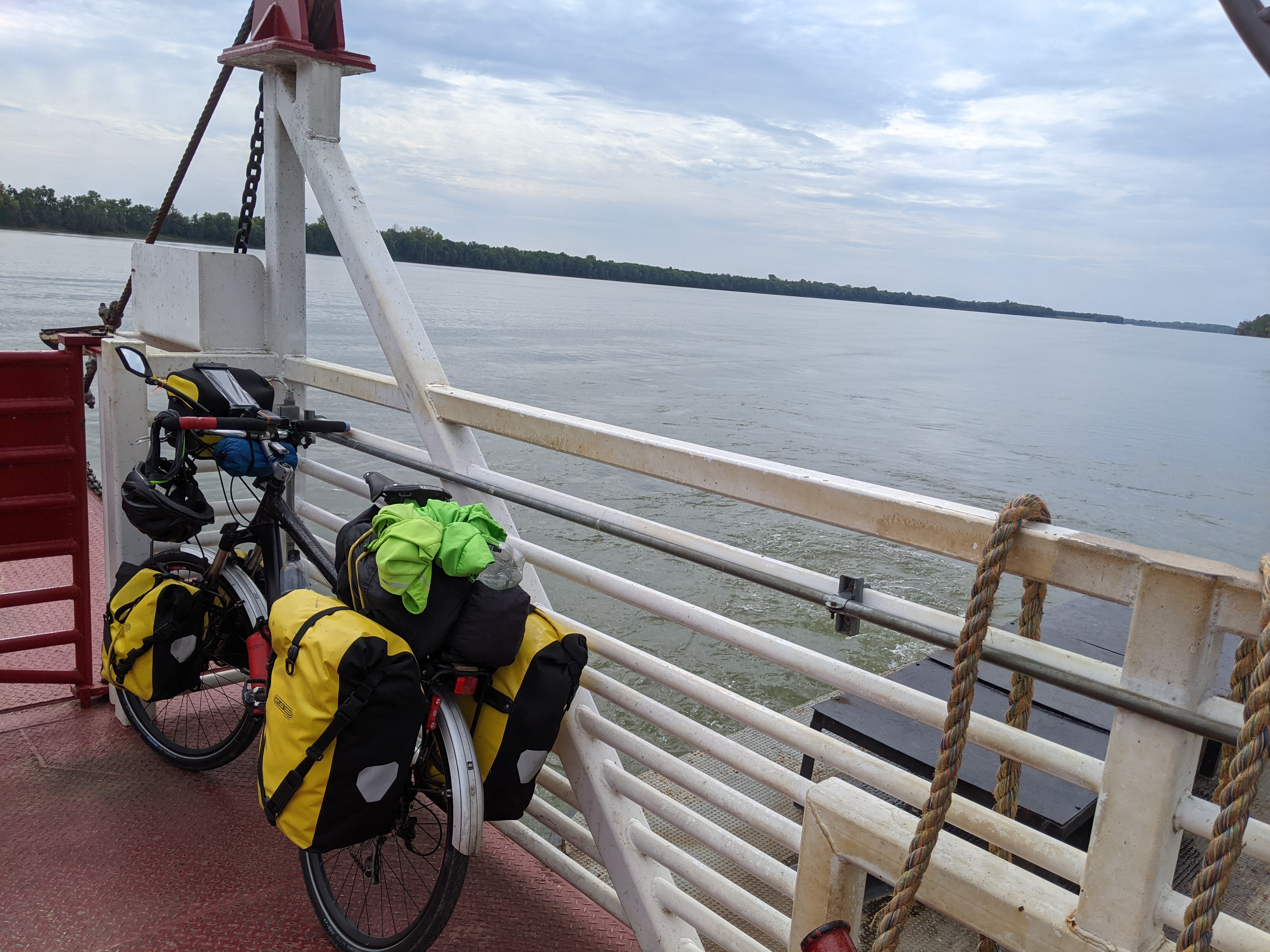 After that, I got to the Ohio River and the ferry at Cave-in-Rock. The last time I had been on a ferry with my bike was crossing the River Fowey at Bodinnick in Cornwall on my End2End trip. The ferry was free and rather rudimentary: a raft with a tug attached by a push bar, switching over after each crossing. Also, the docking was very simple, coping with the variations in in river levels. I suppose they had years of experience developing a system that was cheap and effective.